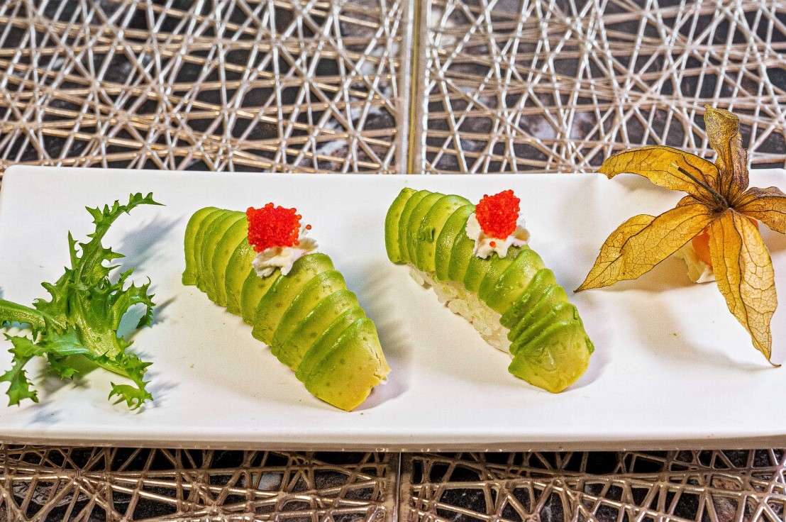 Nigiri di avocado con Fila e tobiko rosso (per la versione vegetariana specificare che si desiderano senza tobiko)
